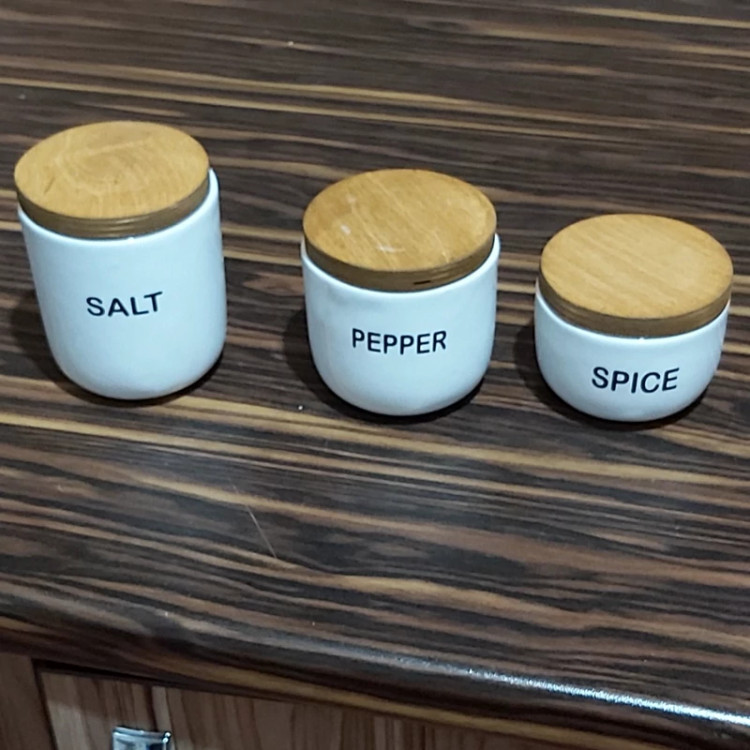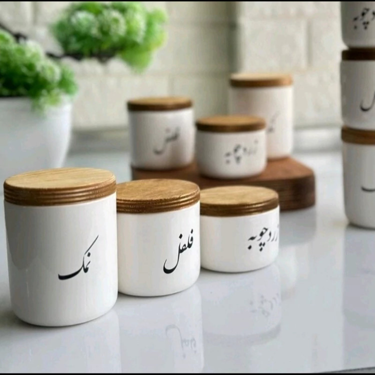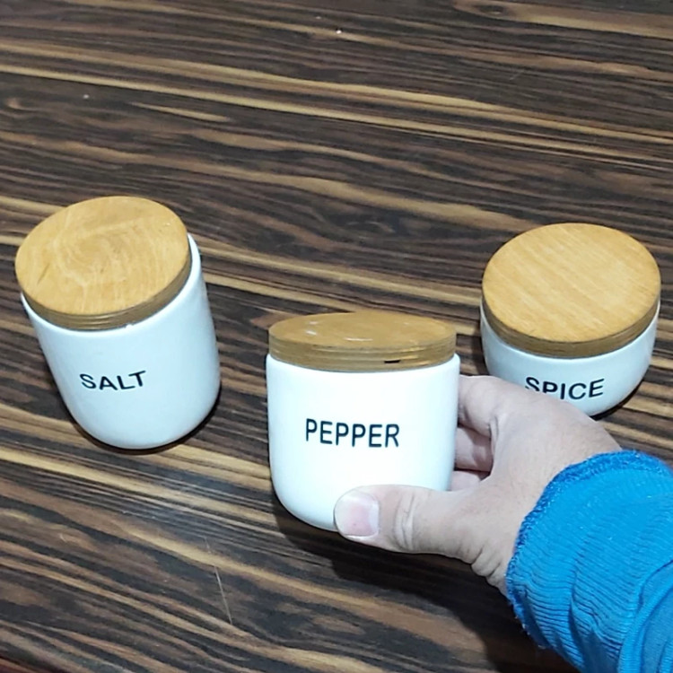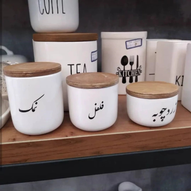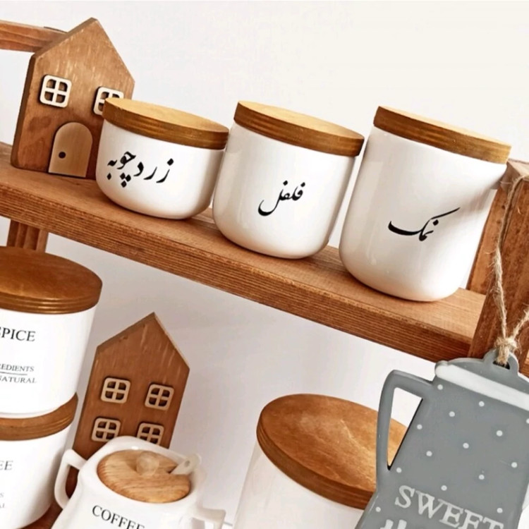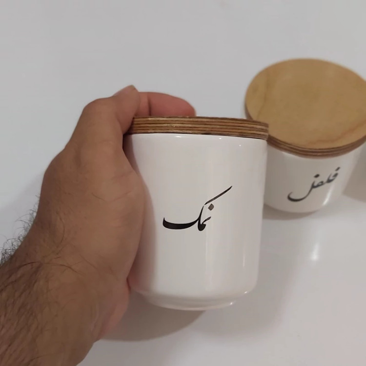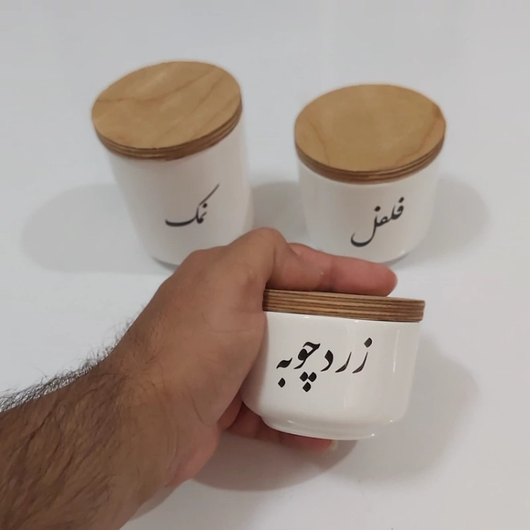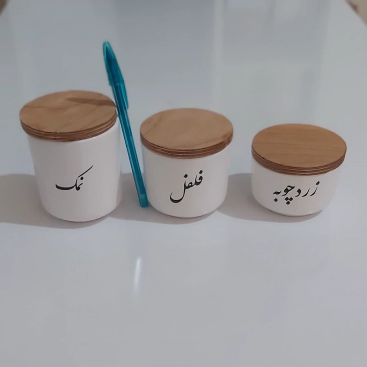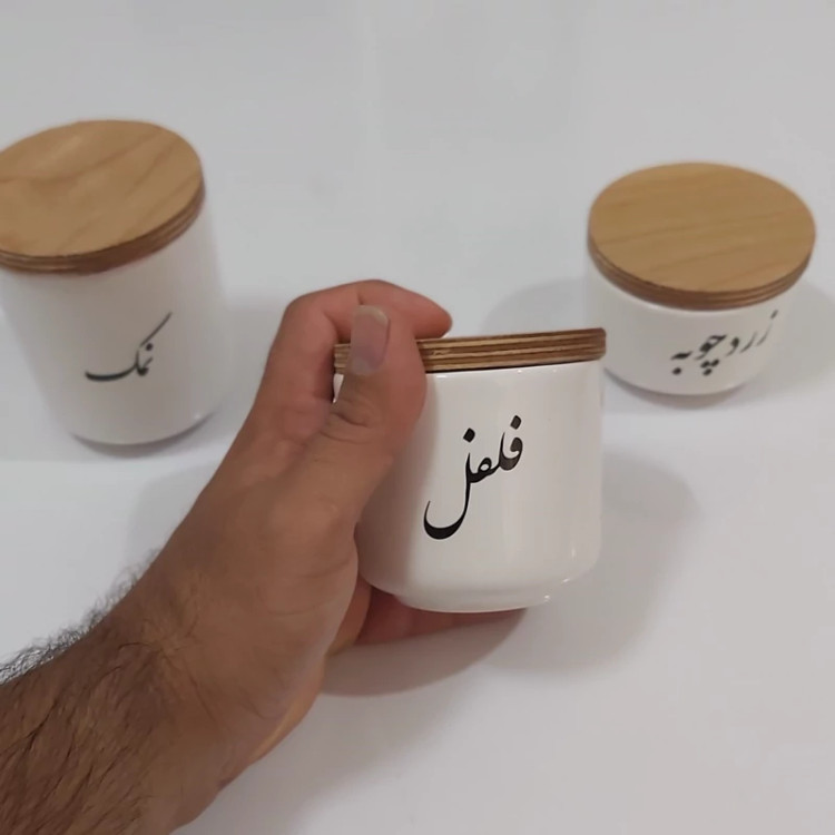 بانکه سرامیکی تکست با درب چوبی نوشته فارسی پاسماوری 3 تیکه(فقط نمک فلفل زردچوبه)