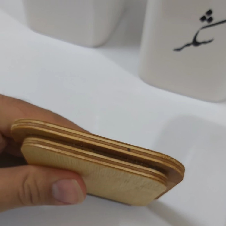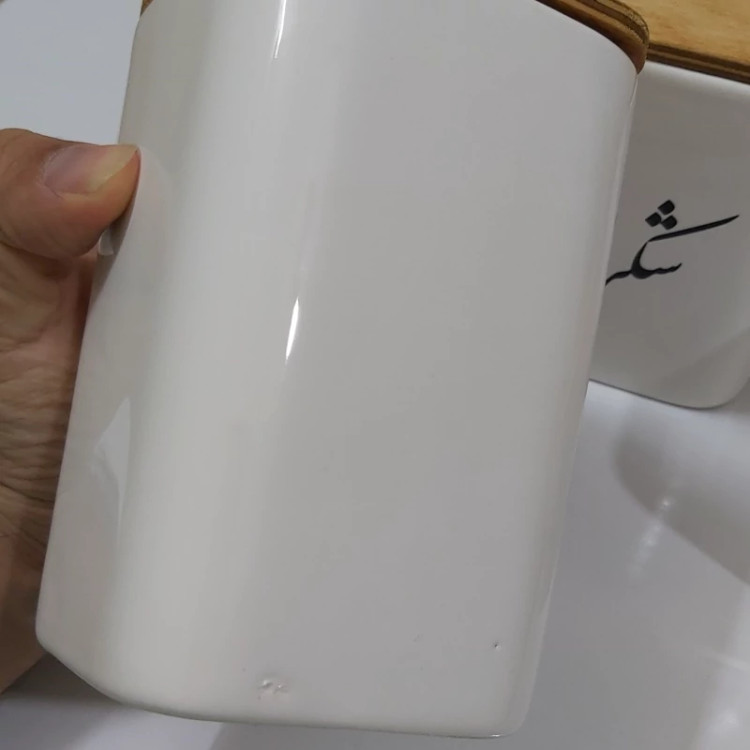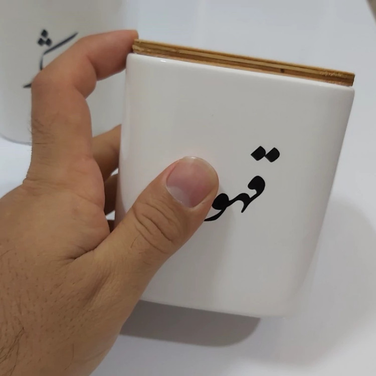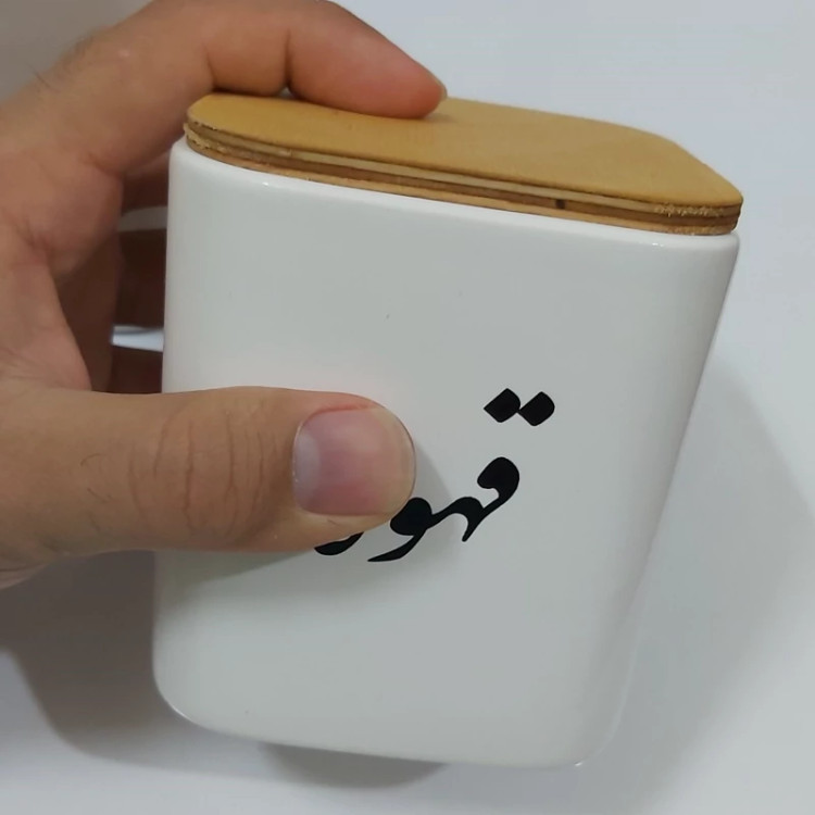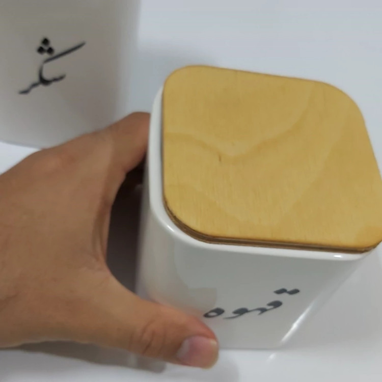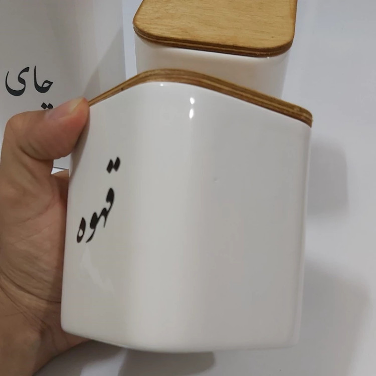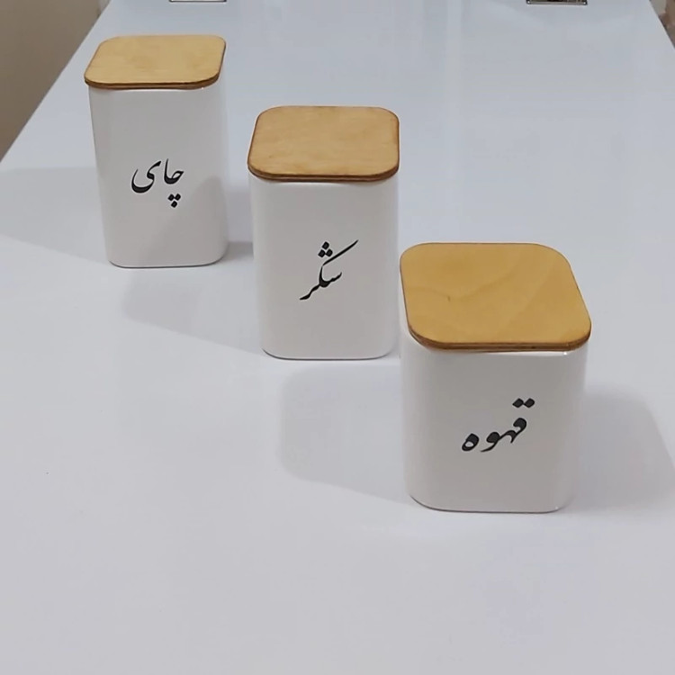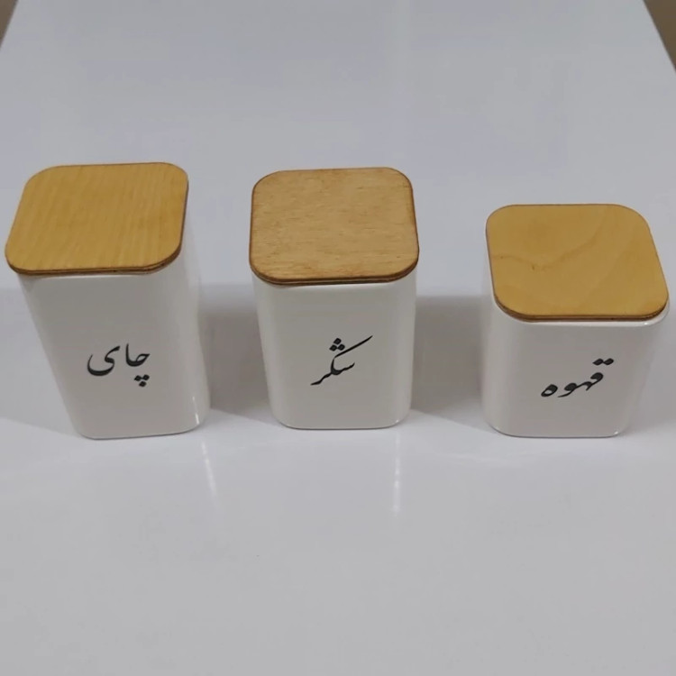 بانکه سرامیکی تکست با درب چوبی نوشته فارسی پاسماوری 3 تیکه (قهوه شکر چای)مربع