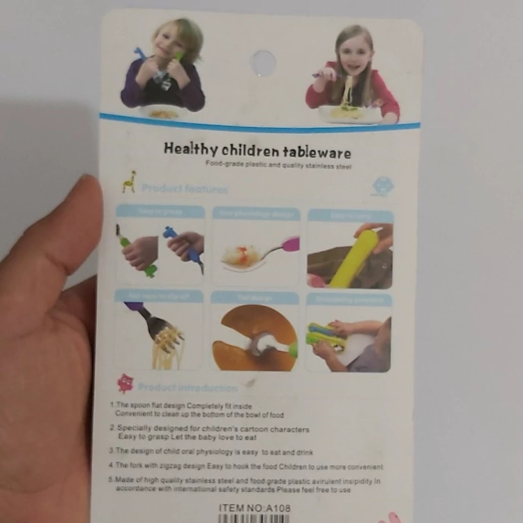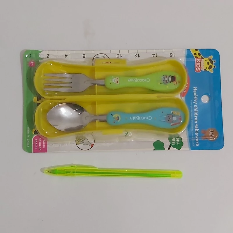 قاشق چنگال کودک رنگی(فقط یک طرح)جنس قاشق استیل و دسته پلاستیک همراه جا قاشقی مخصوص