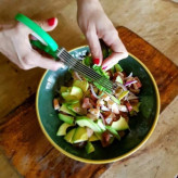 قیچی دارای تیغههای استیل فولادی ضدزنگ پرقدرت با قابلیت تیز کردن مجدد مناسب برای خرد کردن سریع و راحت سبزیجات و کارهای سبک آشپزخانه/ یا در حد هرس شاخه های جوان