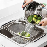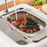 آبکش کشویی استیل در مقایسه با نوعهای پلاستیکی از کیفیت ساخت و مقاومت بالاتری در برابر ضربه و وزن زیاد برخوردارند. حتی از لحاظ بهداشتی هم میتوان گفت در ردهی بالاتری قرار دارند. « آبکش استیل پانچ کشویی» که شامل یک عدد آبکش با ابعاد و عمق ثابت بوده و برای استفاده در منزل پیشنهاد میشود. بخش دسته های کشویی این قابلیت را دارد که در هر اندازه ای تنظیم شود و شما بر روی انواع سینک با دهانه های مختلف میتوانید آن را قرار دهید. این محصول ساخته شده از استیل ضدزنگ است و سالهای سال در آشپزخانه شما مورد استفاده قرار خواهد گرفت. آبکشها دارای سوراخهای پانچی صاف و یکدستی هستند که هیچ سطح برآمدهای روی آنها مشاهده نخواهید کرد که به دستان شما آسیب وارد کند. تمامی سایزها دارای دستههایی در طرفین بوده و در کف آنها پایههایی تعبیه شده که باعث میشود با سطح زمین تماس نداشته و آب موجود در آن بهخوبی تخلیه شود. برای آبکش کردن برنج و اسپاگتی، شستن سبزیحات و سایر موارد میتوانید از این محصول استفاده کنید.