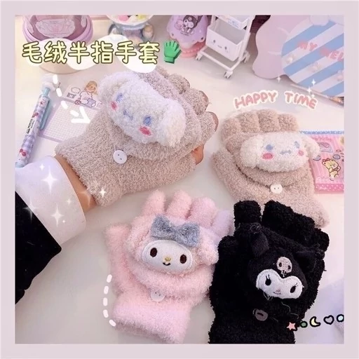 دستکش کرومی ملودی کیتی سینامورول پوم پوم کیوت فانتزی جنس پشمی تدی پشمالویی نرم و گرم زمستانه لطیف دست کش نیم انگشت