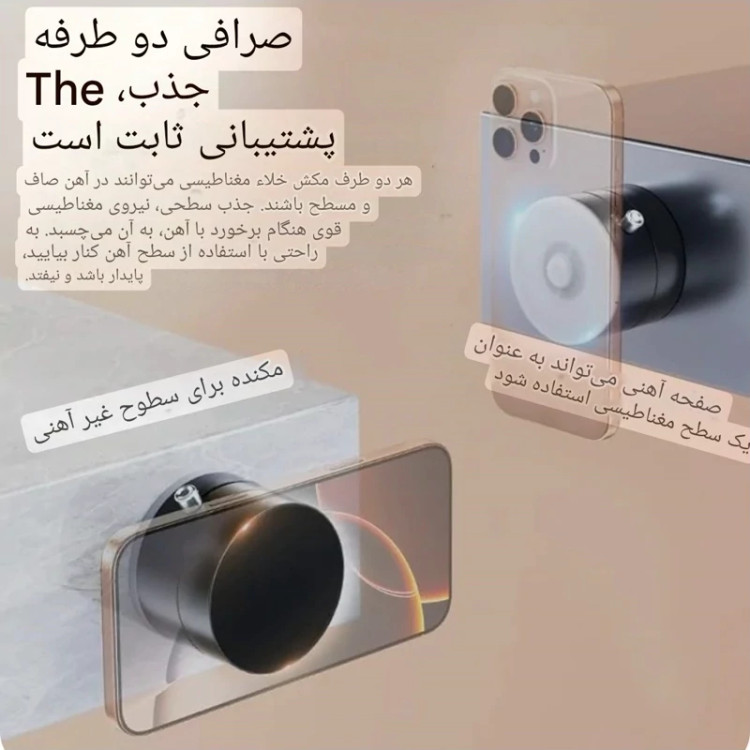 قابل نصب بر روی سطوح صاف مانند: سرامیک، صفحه میز و کابینت، لبه داشبورد ، مانیتور، آینه وسط خودرو و ...