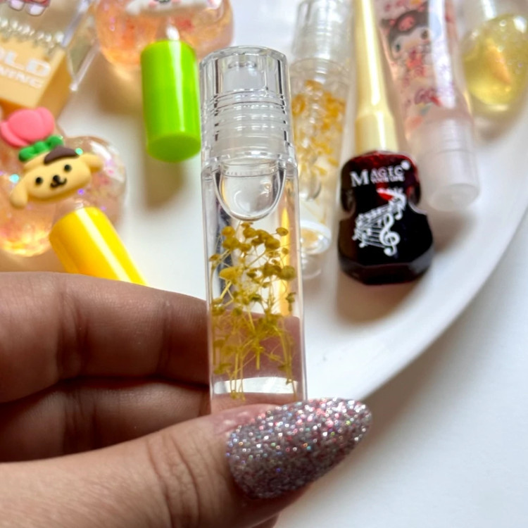 لیپ اویل گلدار برق لب بی رنگ روغنی گل دار خشک شده فانتزی کیوت پینترستی مناسب کادو هدیه برق لب