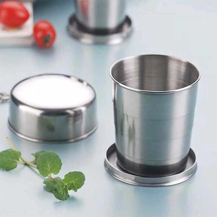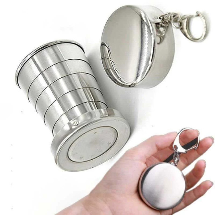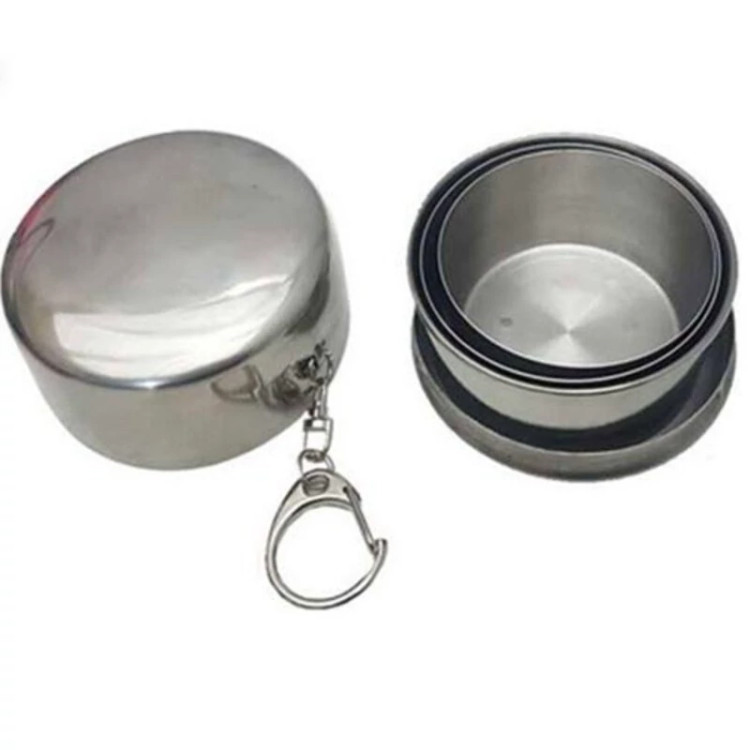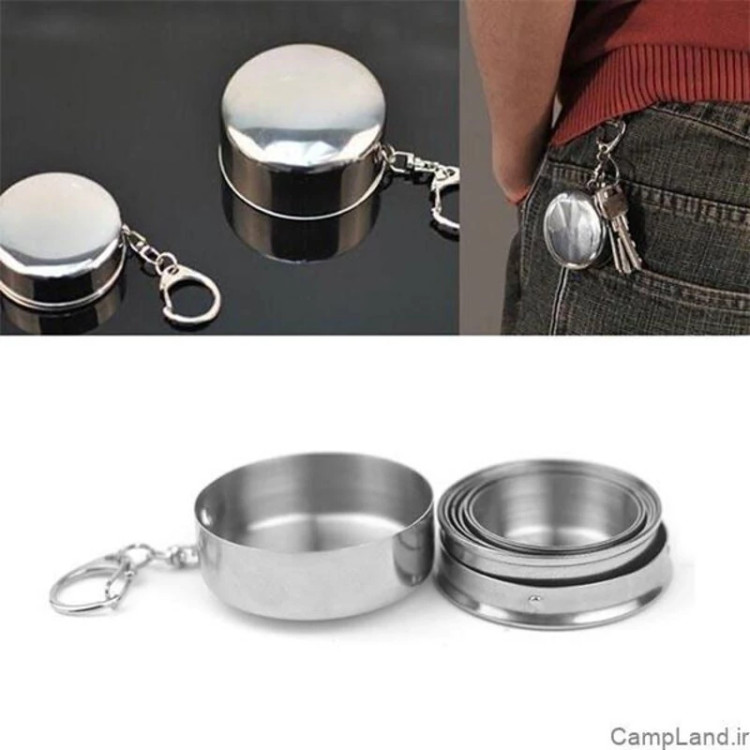 لیوان استیل تاشوی سفری ضد زنگ و درب دار و دارای قلاب آویز لیوان کوهنورردی تاشو