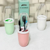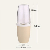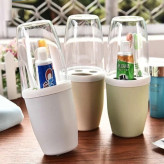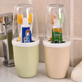 مسواکی لیوانی درب دار ، نمونه ای متفاوت از جا مسواکی های معمولی است که ظاهری زیبا همراه با عملکردی کاربردی دارد . جا مسواکی لیوانی ، از جنس پلاستیک با کیفیت تولید شده و شامل سه قسمت با عنوان لیوان ، استند و درپوش می باشد . لیوان به صورت استوانه ای همراه با قوس در قسمت انتهایی طراحی شده ، موضوعی که سبب زیبایی و ایجاد جلوه ای دلنشین برای محصول شده ، استند درواقع همان صفحه سفید رنگی است که بر روی دهانه لیوان قرار می گیرد . بر روی این صفحه چهار سوراخ در دو ابعاد وجود دارد که از آنها می توان برای نگهداری 3 عدد مسواک به همراه یک خمیردندان به صورت کاملاٌ مجزا از یکدیگر استفاده نمود ، اما در نهایت بزرگترین حسن این جا مسواکی شیک را می توان پوشش شفاف رویین آن عنوان کرد ، پوششی که دقیقاً ظاهری مشابه با طراحی لیوان دارد ، با این تفاوت که کاملاً شفاف است و به عنوان درب از آن استفاده می شود . امکان مشاهده محتویات درون محفظه و همچنین محافظت از مسواک ها در برابر آلودگی های محیطی را مهمترین خصوصیات درب در کنار ایجاد جذابیت ظاهری محصول می توان عنوان نمود . علاوه بر تمام آنچه گفته شد ، قابلیت جابه جایی و پوشش کامل محتویات ، امکان به همراه داشتن محصول در سفر و کمپینگ برای نگهداری صحیح از مسواک و خمیردندان در شرایط مختلف نیز دیگر ویژگی جا مسواک و خمیر دندان مسافرتی است که به سایر خصوصیات آن باید اضافه کرد .