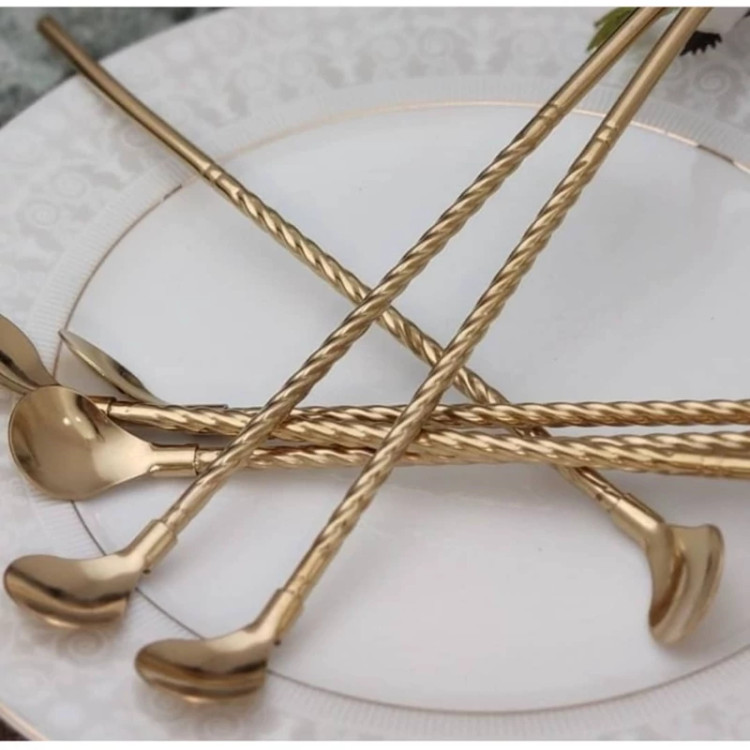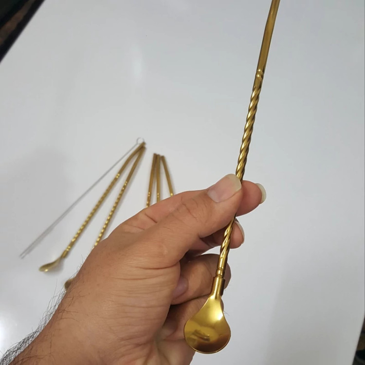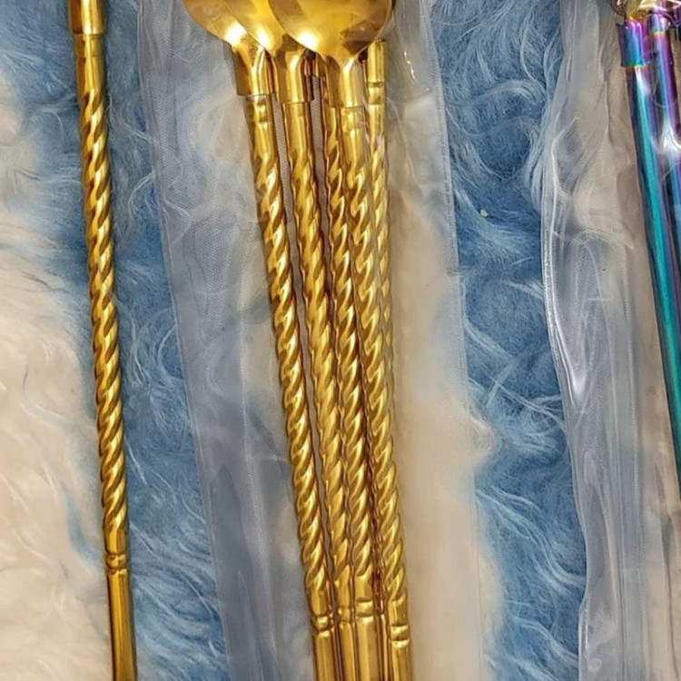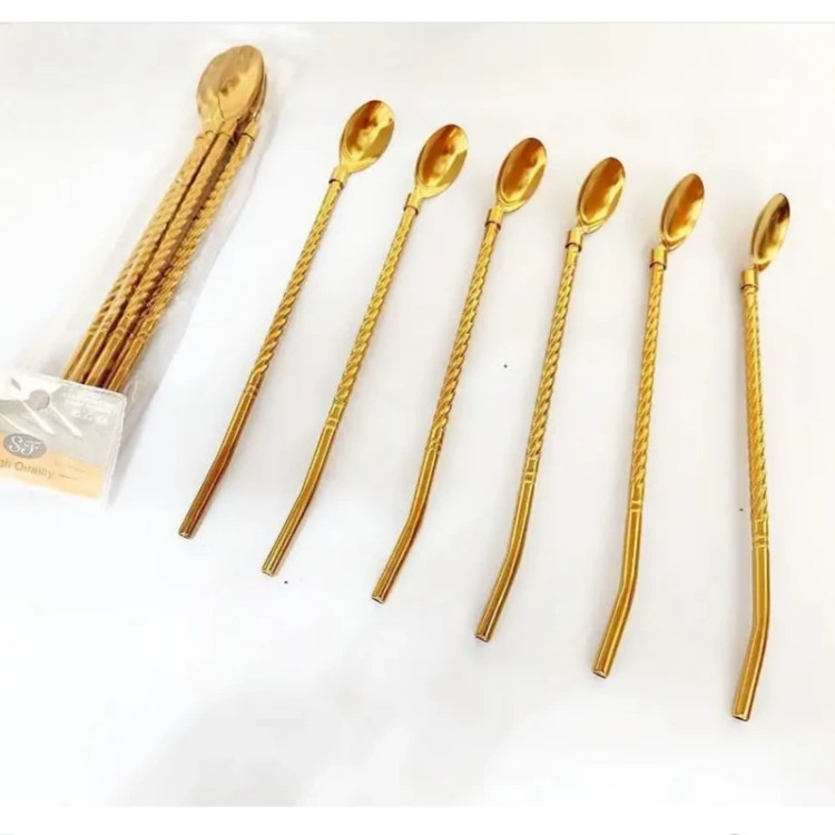 قاشق نی دار طلایی6 تایی شربت استیل وارداتی طرح پیچی رنگ ثابت همراه فرچه شستشو